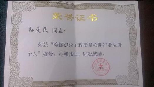 近日,從中國建筑業協會工程建設質量監督與檢測分會傳來喜訊,我公司孫愛民副總經理榮獲全國建設工程檢測行業先進個人。