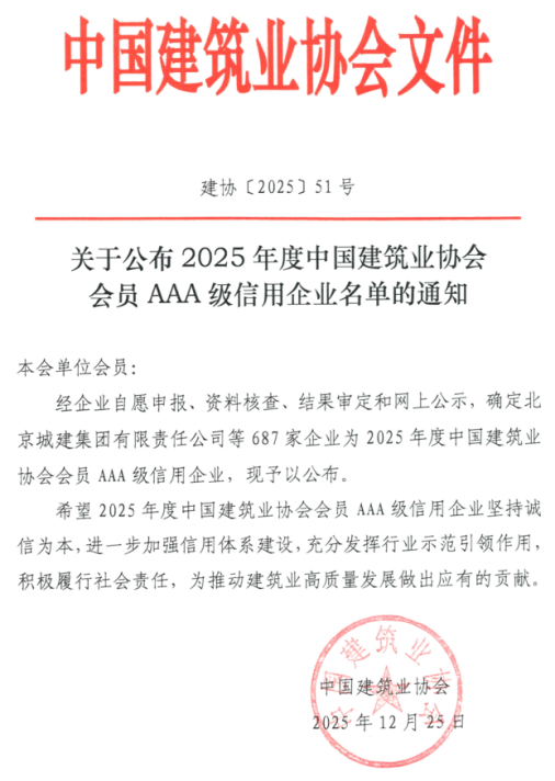 日前,中國建筑業協會公布2025年度中國建筑業協會會員AAA級信用企業名單,合肥市建投集團所屬企業合肥市建設工程監測中心有限責任公司再度榜上有名。